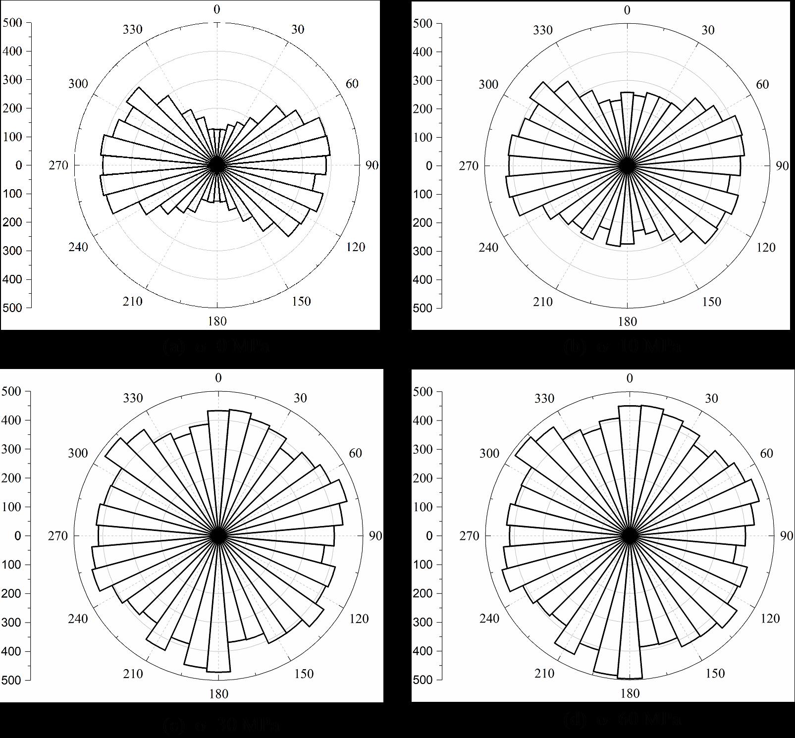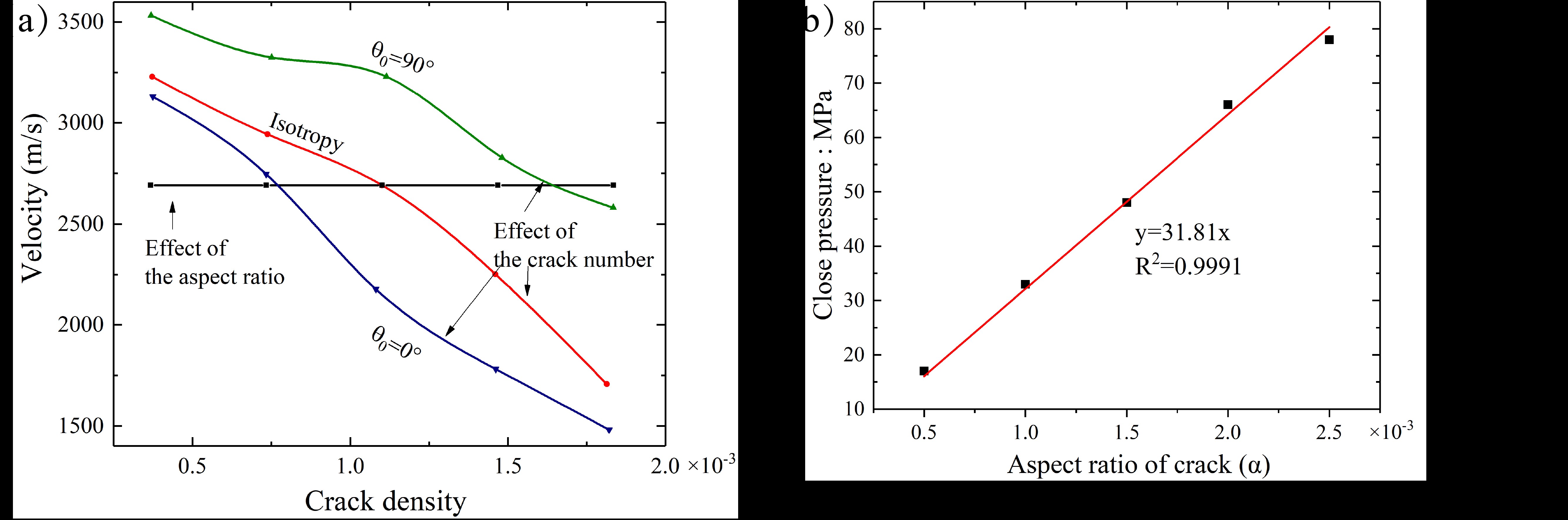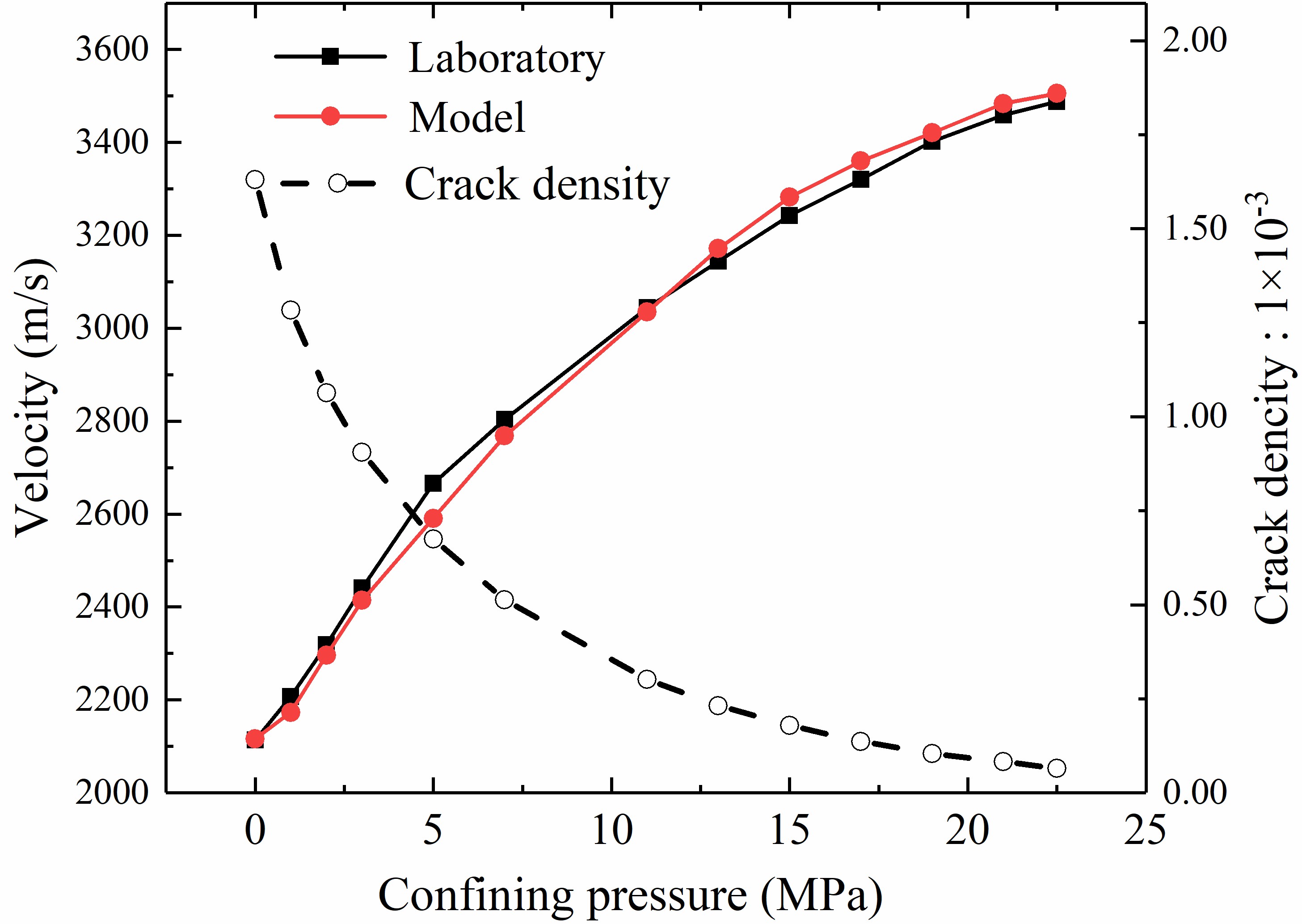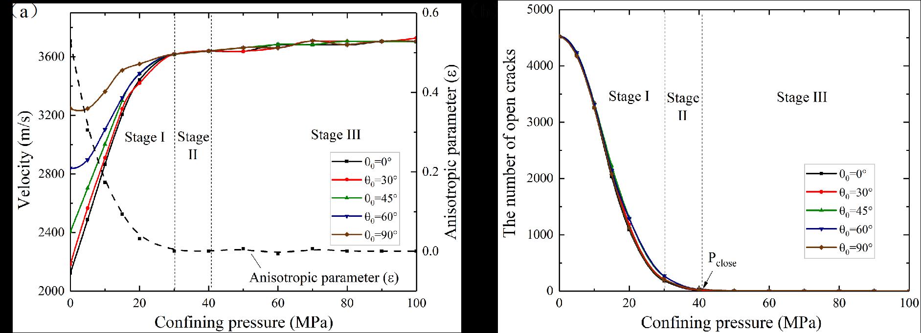 研究结果表明:对于各向同性的岩石,P波波速受控于微裂纹数量,而闭合压力仅与微裂纹纵横比有关(图2);当岩石中的微裂纹定向排列时,波速测量路径上的微裂纹数量的不同是造成P波波速具有各向异性的原因(图3-4);P波波速对围压的响应同时受控于微裂纹数量和纵横比,波速最小值由裂纹数量决定,而微裂纹纵横比越小(裂纹越窄),波速对围压越敏感(图5)。通过波速反演裂纹密度需要考虑微裂纹的数量、纵横比和方向等特征。