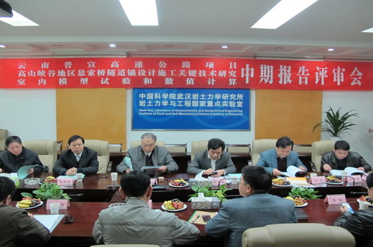 11月20日,由中国科学院武汉岩土力学研究所承担的云南普宣高速公路项目“高山峡谷地区悬索桥隧道锚设计施工关键技术研究”室内模型试验和数值计算中期成果评审会在武汉召开,评审会由云南普宣高速公路指挥部组织,评审委员会由葛修润院士、周创兵教授、郝宪武教授、李新平教授、郑宏研究员等7名专家组成。