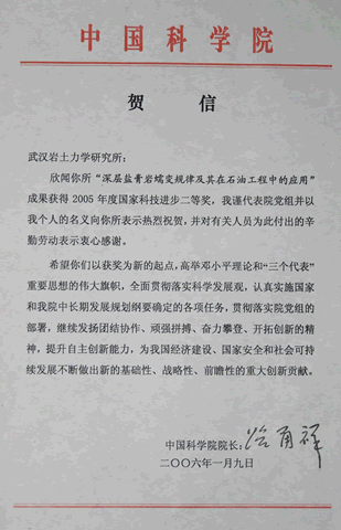 2006年1月9日,全国人大副委员长,中国科学院院长、院党组书记路甬祥院士给武汉岩土所发来贺信,代表院党组并以个人名义祝贺岩土所“深层盐膏岩蠕变规律及其在石油工程中的应用”获2005年度国家科技进步二等奖,同时对有关人员为此付出的辛勤劳动表示衷心感谢。