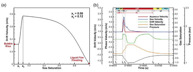 图3. (a) 漂移速度与气体饱和度关系;(b) 井筒内部两相流流态的转变对喷发的控制及自增强与自限制作用对间歇性的控制