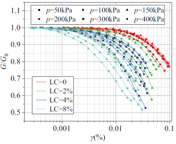 图3 石灰改性膨胀土小应变剪切模量衰减特性