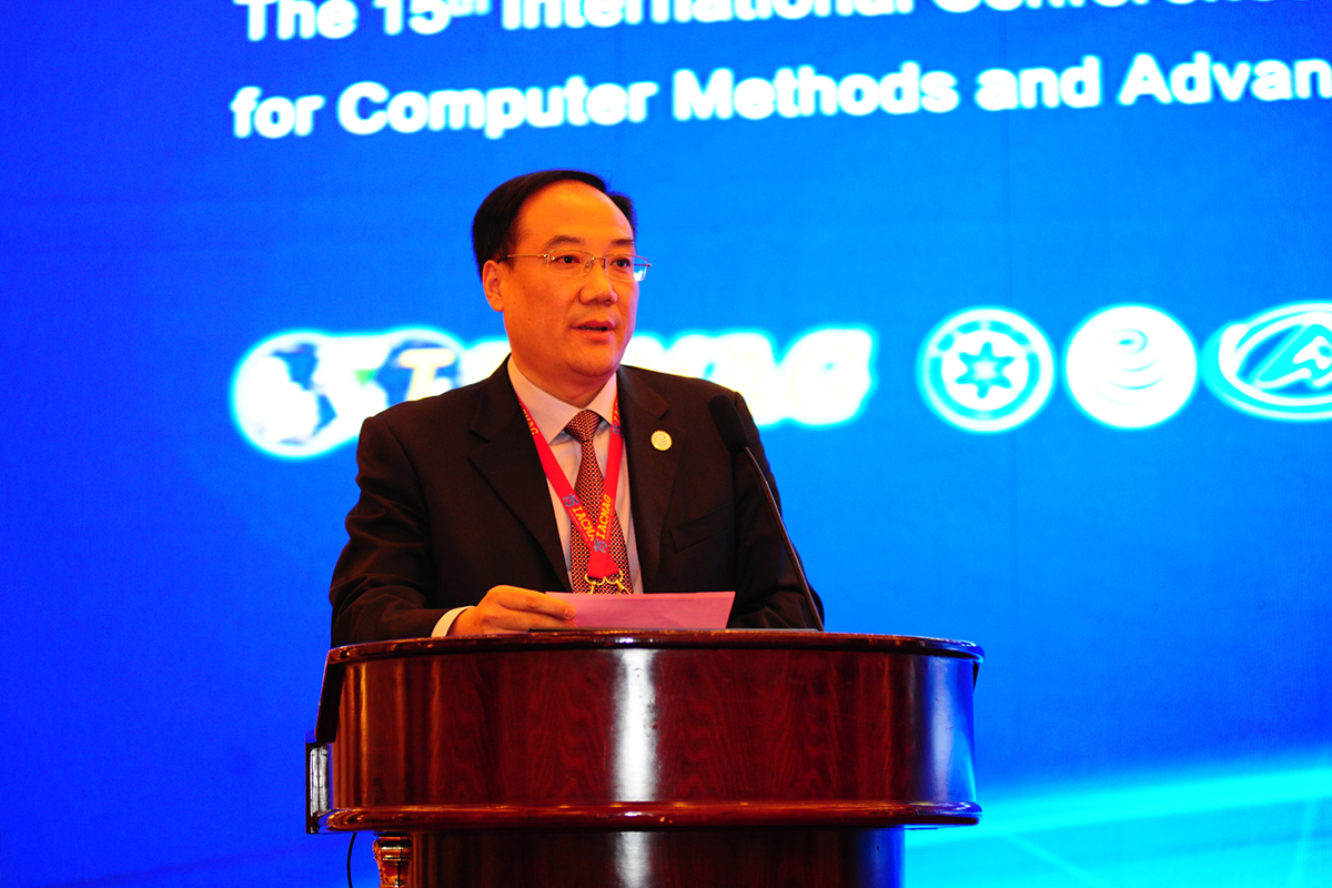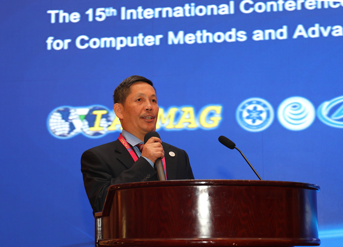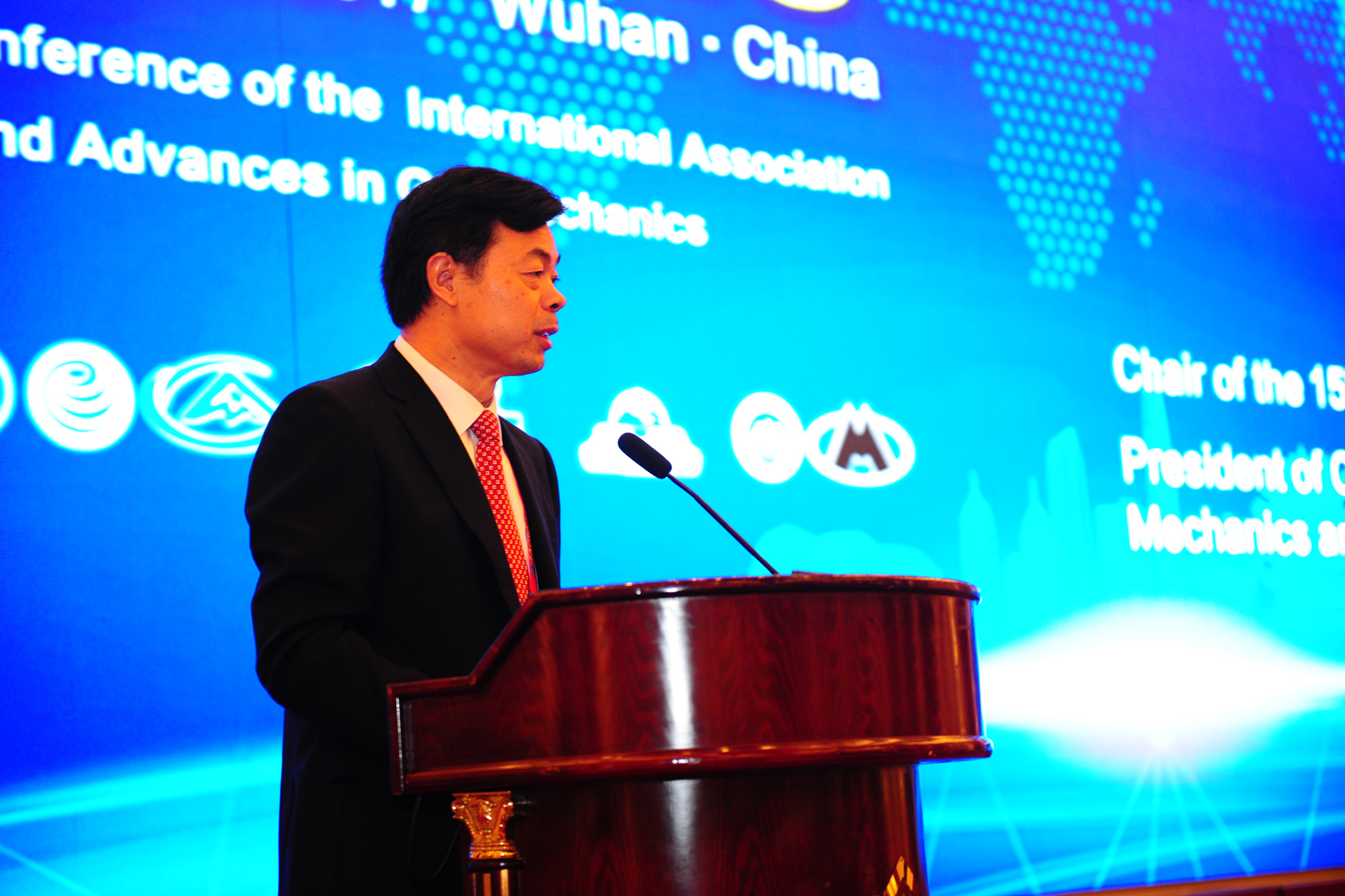 大会主席、中国岩石力学与工程学会理事长、岩土力学与工程国家重点实验室主任冯夏庭研究员致开幕词,冯夏庭对与会学者的到来表示热烈欢迎,感谢国际岩土力学计算方法与进展协会将第15届大会交给中国举办,并介绍了会议的组织情况和特点,特别感谢为本次大会的筹备所付出辛勤劳动的组织方、国际评审专家以及会议支持、赞助方。希望与会专家、学者融入会议、享受会议,畅谈交流,互相启迪,共谋发展。
