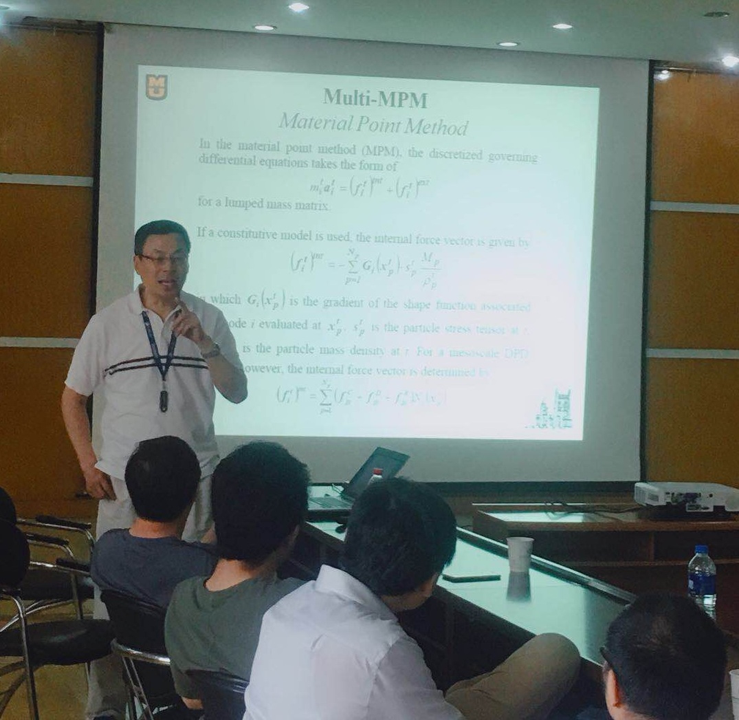 陈教授及其研究团队针对结构在极端荷载条件下的结构响应以及破坏过程,提出了一种基于多尺度分析的物质点方法,其可以在统一的计算域下结合分子动力学(MD),耗散粒子动力学(DPD)以及物质点方法(MPM),可以更为全面的从细观尺度、介观尺度以及宏观尺度对结构的破坏响应进行了细致的描述。该方法不仅仅可以揭示结构的宏观破坏过程,同时可以深入的阐述结构的微观破坏机理、机制,该方法引发了现场科研人员和学生们与陈教授之间的热烈讨论,大家各抒己见,互相探讨,学术交流气氛热烈。会后,实验室李邵军研究员、江权研究员、王斌副研究员和陈震教授以及美国密西西比大学江山助理教授进行了深入的交流,并就可能的相关合作领域进行了细致的讨论,并初步构建了长期合作框架以及研究重点。