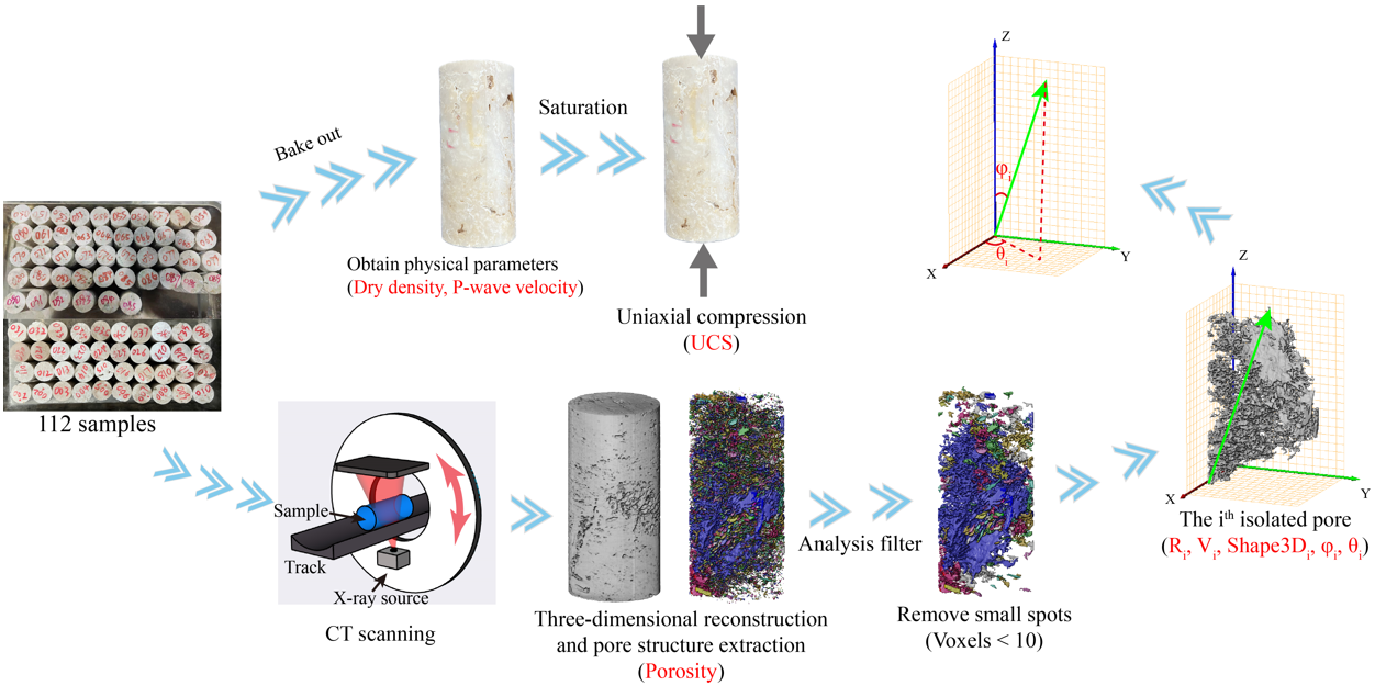 该方法提出孔隙张量的概念,首次实现了格架结构礁灰岩和砾块结构礁灰岩孔隙结构的有效表征,构建了“CT扫描-机器学习-力学预测”的交叉技术路径,初步解决了离散性显著的珊瑚礁灰岩力学参数的预测难题,为建立孔隙结构与力学行为之间的关系提供了一种可行的思路。