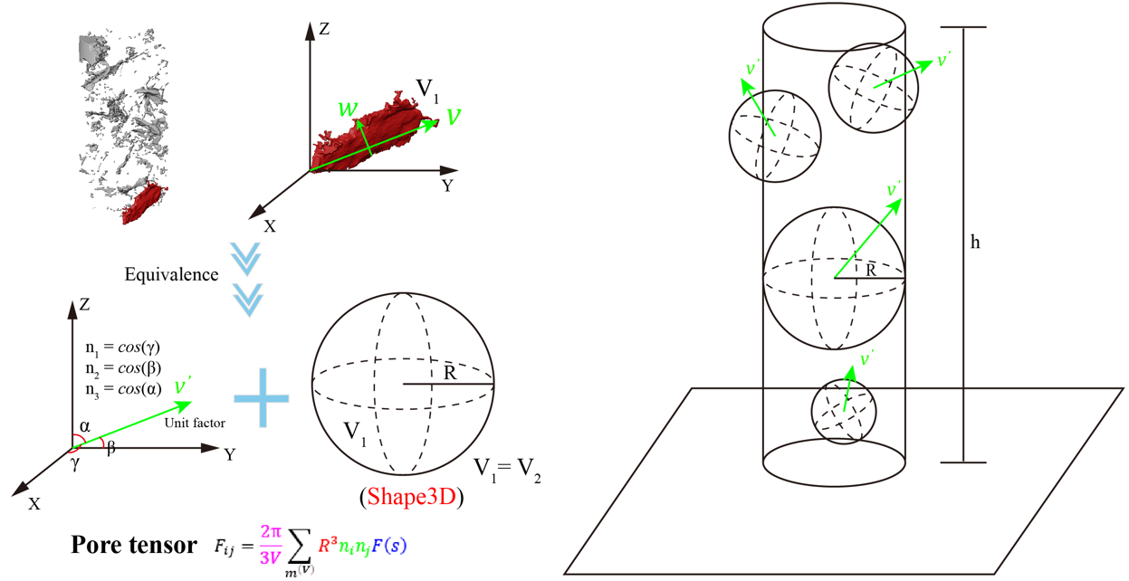 为表征孔隙结构,本研究将孔隙的等效半径、归一化的形状因子、方位角等融合提出了孔隙张量来表征其孔隙结构,反映其分布方位、形貌、尺寸分布及孔隙率(图3)。分析发现其球张量的第一不变量能表征孔隙的各向同性部分,偏张量的第二不变量能表征孔隙的各向异性部分。参数相关性分析发现纵波波速与礁灰岩的强度几乎不相关,与传统岩石的波速依赖性不同,归因于孔隙改变了声波的传播路径。
