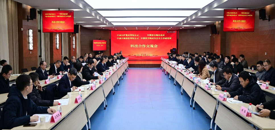 2026年2月4日,中国五矿集团有限公司、中国冶金地质总局和中国中铁股份有限公司等央/国企领导和专家一行,到中国科学院武汉岩土力学研究所开展科技合作交流。中国五矿集团首席科学家、首席技术专家及下属公司的董事长、总经理、院长、总工程师,以及中国工程院院士、武汉岩土所研究员杨春和,武汉岩土所部分所领导,所属全国重点实验室领导及科研骨干等各方代表共70余人参加交流会。会议由武汉岩土所副所长、岩土力学与工程安全全国重点实验室副主任施锡林主持。