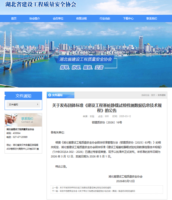 近日,湖北省建设工程质量安全协会正式批准发布团体标准《建设工程基桩静载试验检测数据信息技术规程》(以下简称“《规程》”,编号:T/HBCEQSA 002-2026)。该标准由中国科学院武汉岩土力学研究所主编,多家国内检测机构、设备研发企业及建设监管单位共同编制完成。自2026年5月1日起施行。